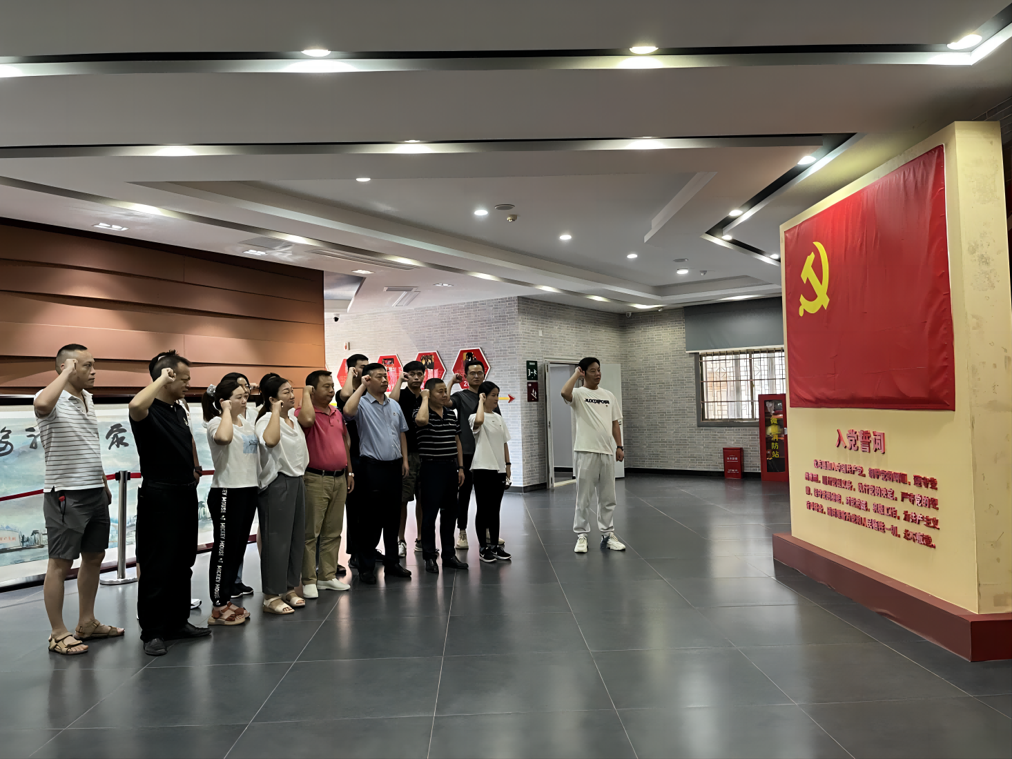 天朗氣清,惠風和暢。在8月5日上午十點,全體黨員同志、入黨積極分子代表來到武漢抗戰(zhàn)第一村---姚家山新四軍第五師舊址紅色教育基地。面對鮮紅的黨旗,黨員們一起重溫入黨誓詞。“我志愿加入中國共產(chǎn)黨,擁護黨的綱領(lǐng),遵守黨的章程……永不叛黨。”錚錚誓言響徹大地。重溫入黨誓詞,既是是初心使命的再宣示、更是接續(xù)奮斗的再出發(fā)。